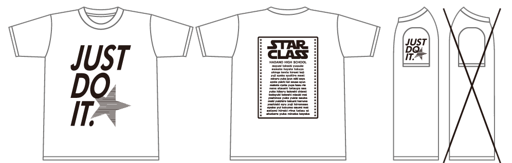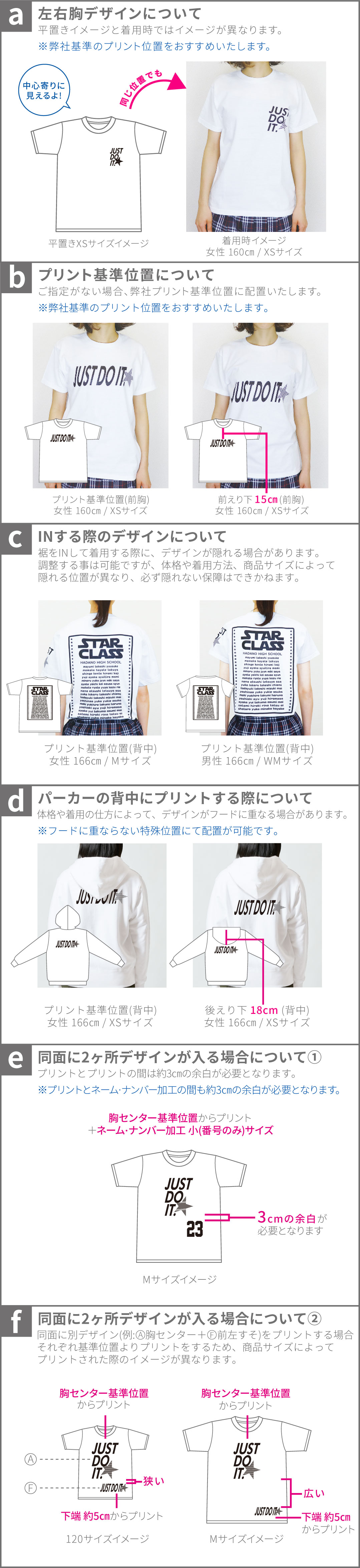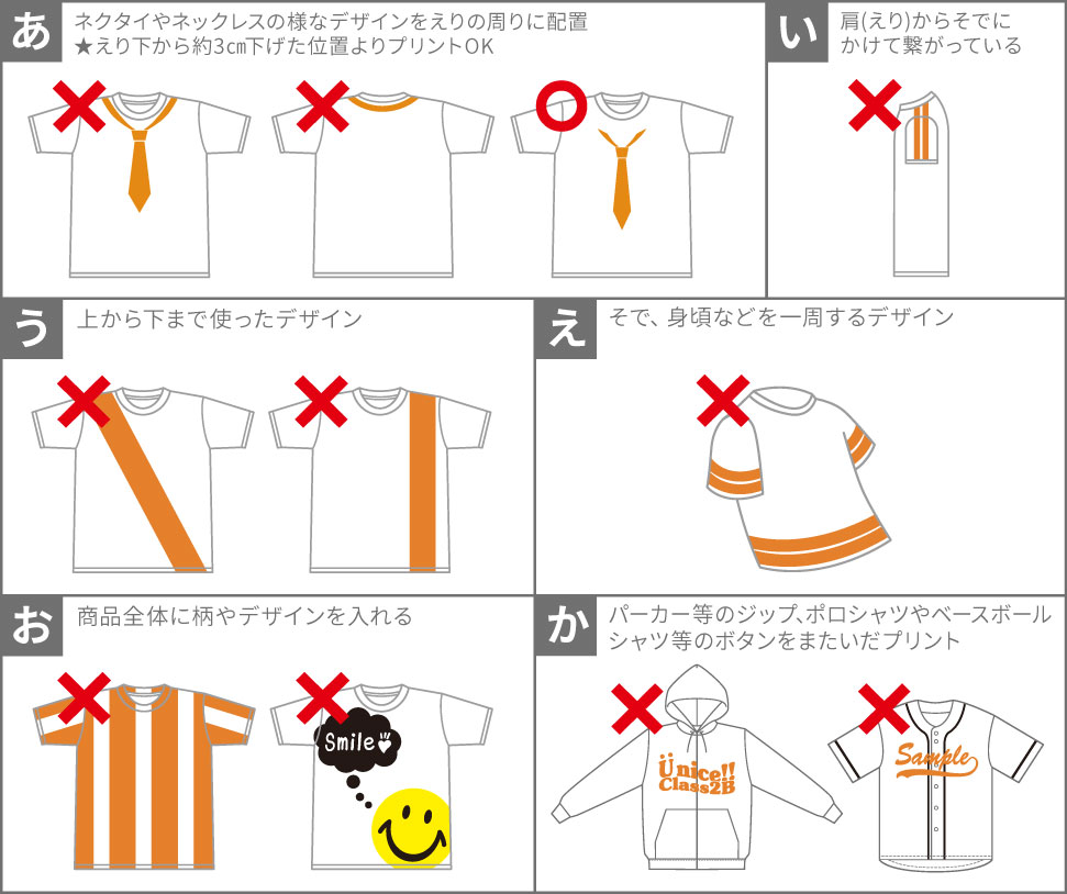 えり下は縫い目から3㎝、横は脇縫い目から2㎝、すそは下端から5㎝離した位置からプリント可能です。